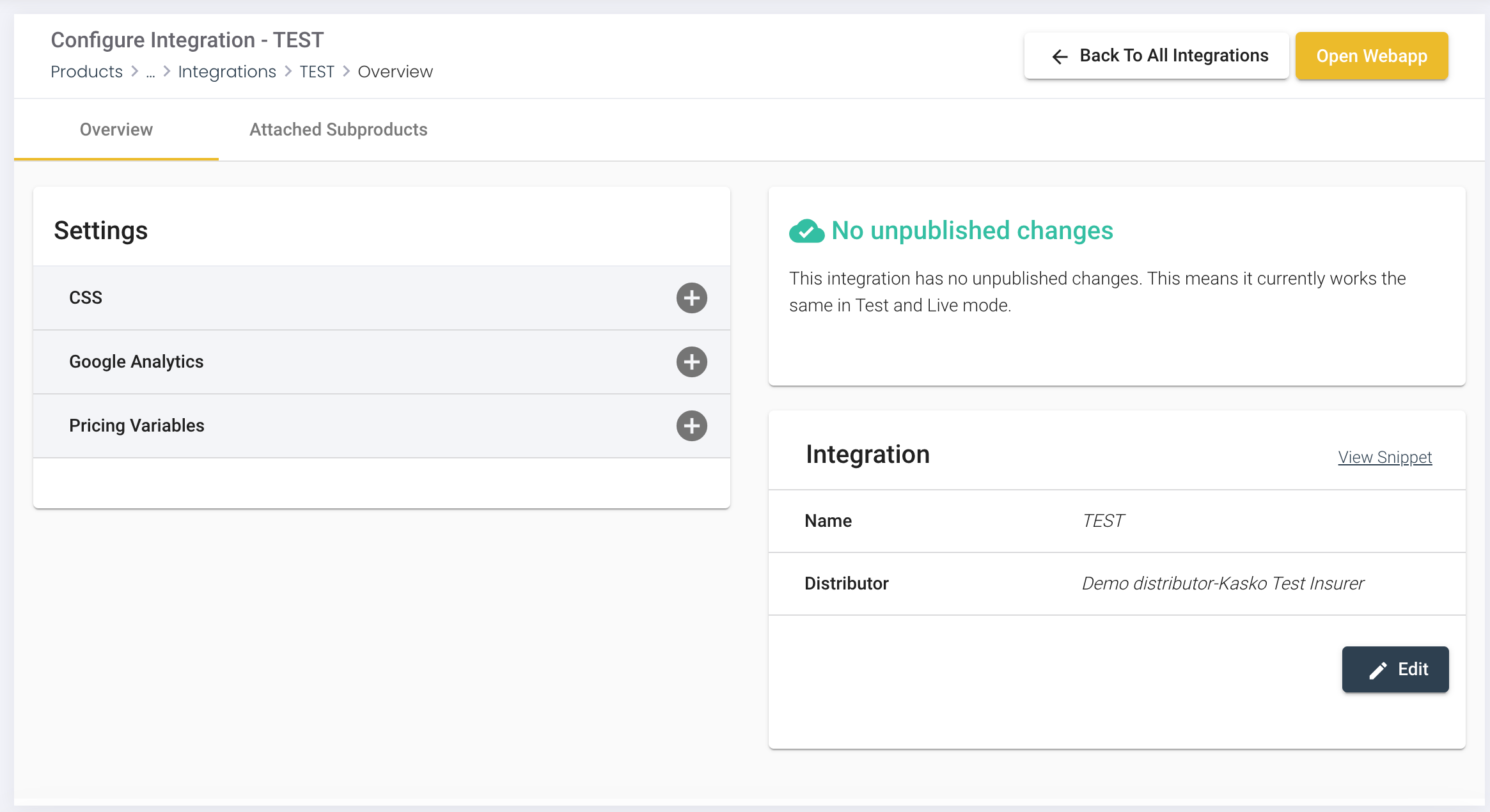 **An Integration** is a sales distribution channel for your product and each integration would require one distributor assigned to it. For example, if your product should be sold via 3 channels, by direct sale, by brokers, and by API partner, you create an integration for the direct-sales distributor, an integration for the broker-partner distributor, and one more integration for the API partner distributor.
