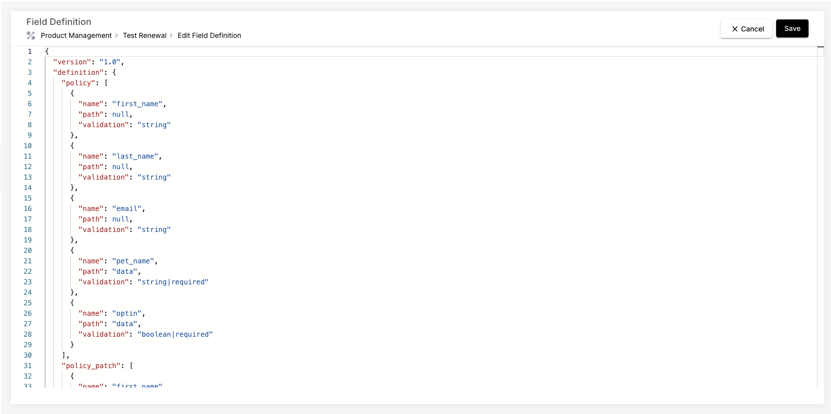 Similarly to the `Validation Rules` in `Pricing Logic`, which defines the validation rules for quote data, Field Definition defines all the validation rules for the policy data. If you use the Webapp Builder to configure the customer journey, you should be able to get the Field Definition from the App export and you can simply copy and paste it for setup.